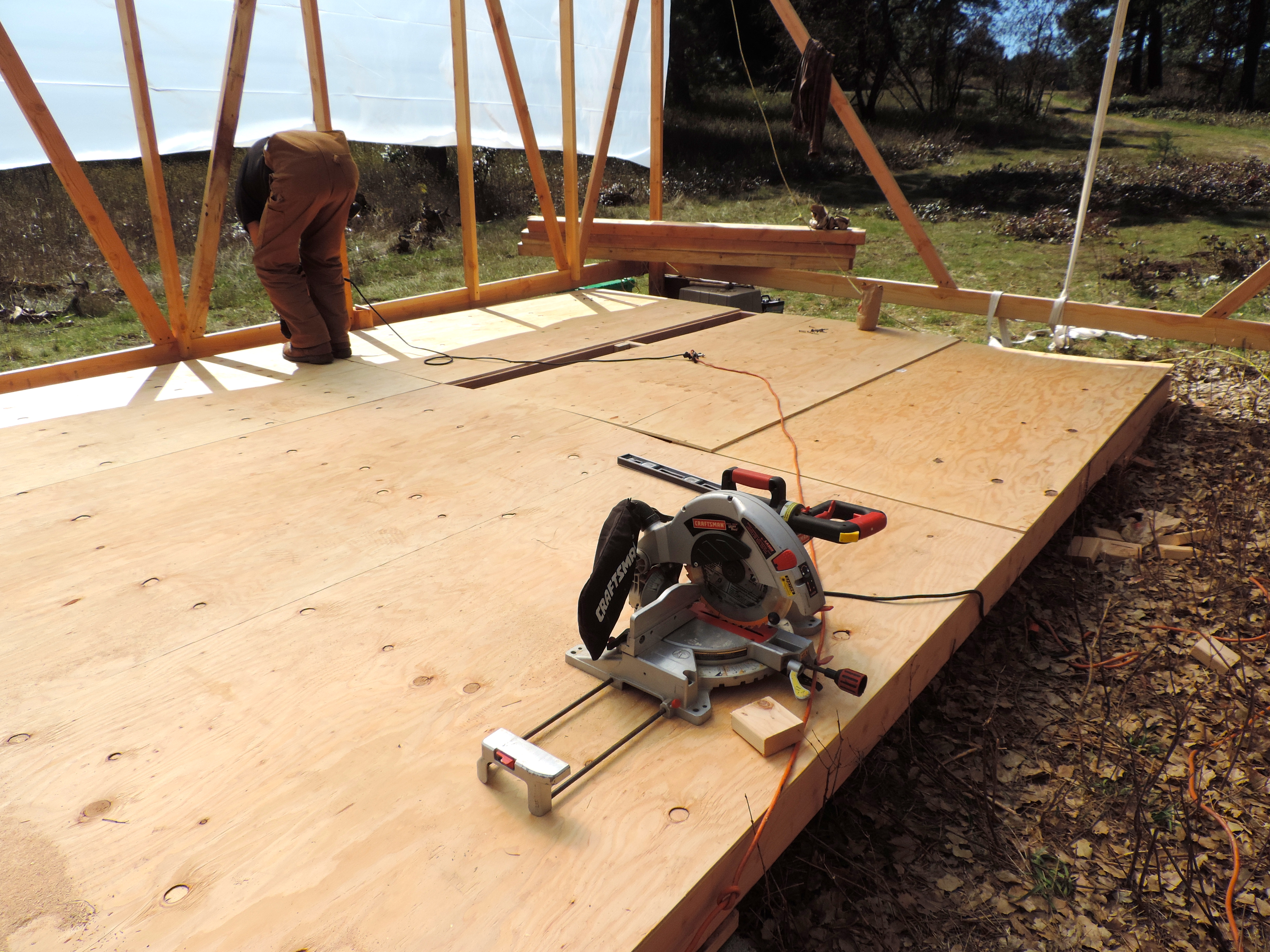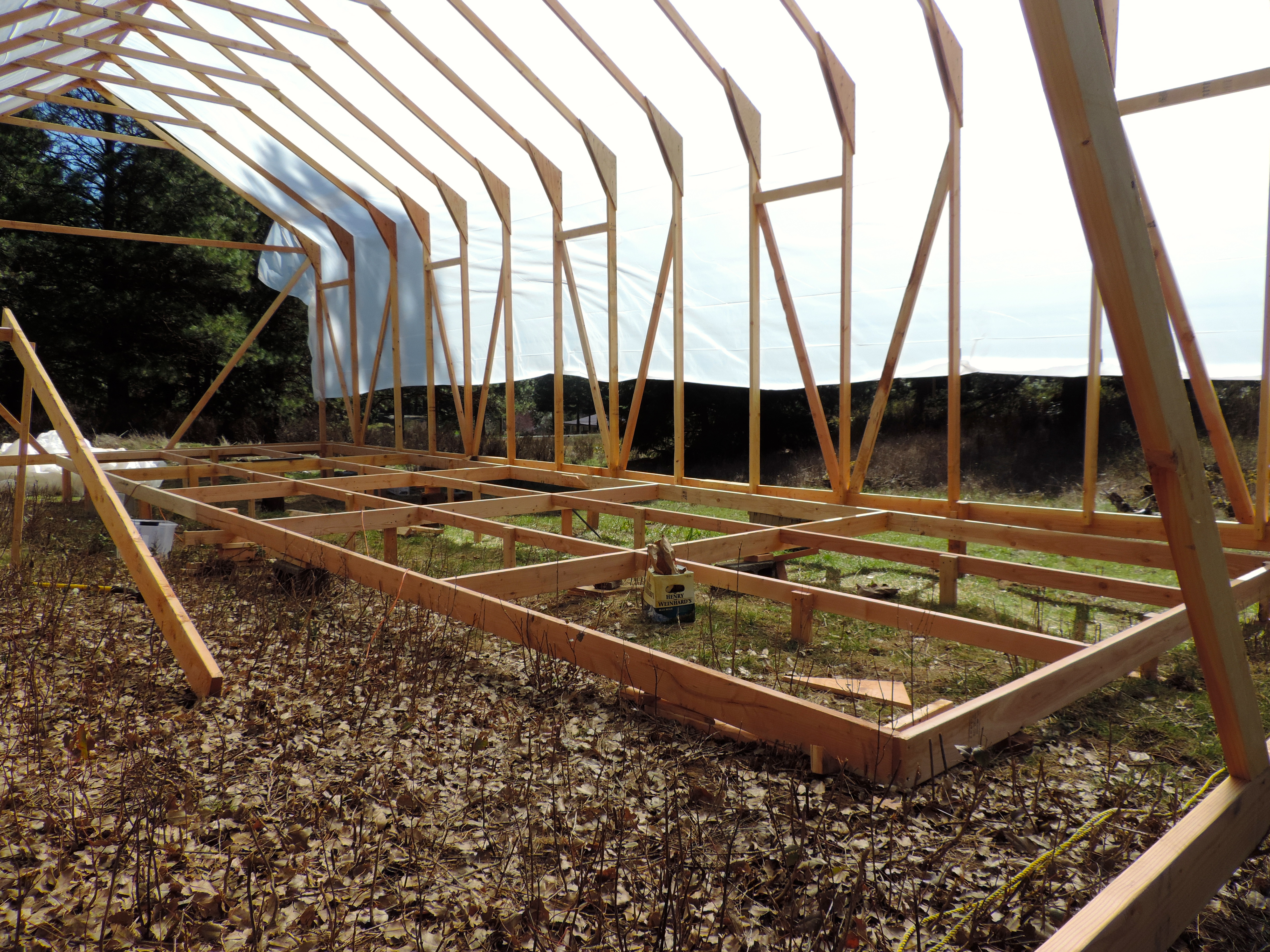 So all this work so far and we haven’t done a single bit of boat building…. Fortunately now that the shed is done it’s time to start lofting! Lofting is basically the process of taking a bunch of measurements from our plans and transferring them onto a full scale grid to draw the lines of the boat in real size. A few things are required for lofting, but most important is a large flat level floor a few feet longer than the length of your boat, and a few feet wider than the height from keel to sheer. Since we didn’t happen to have a 16×40 flat surface laying around I wen’t about building it