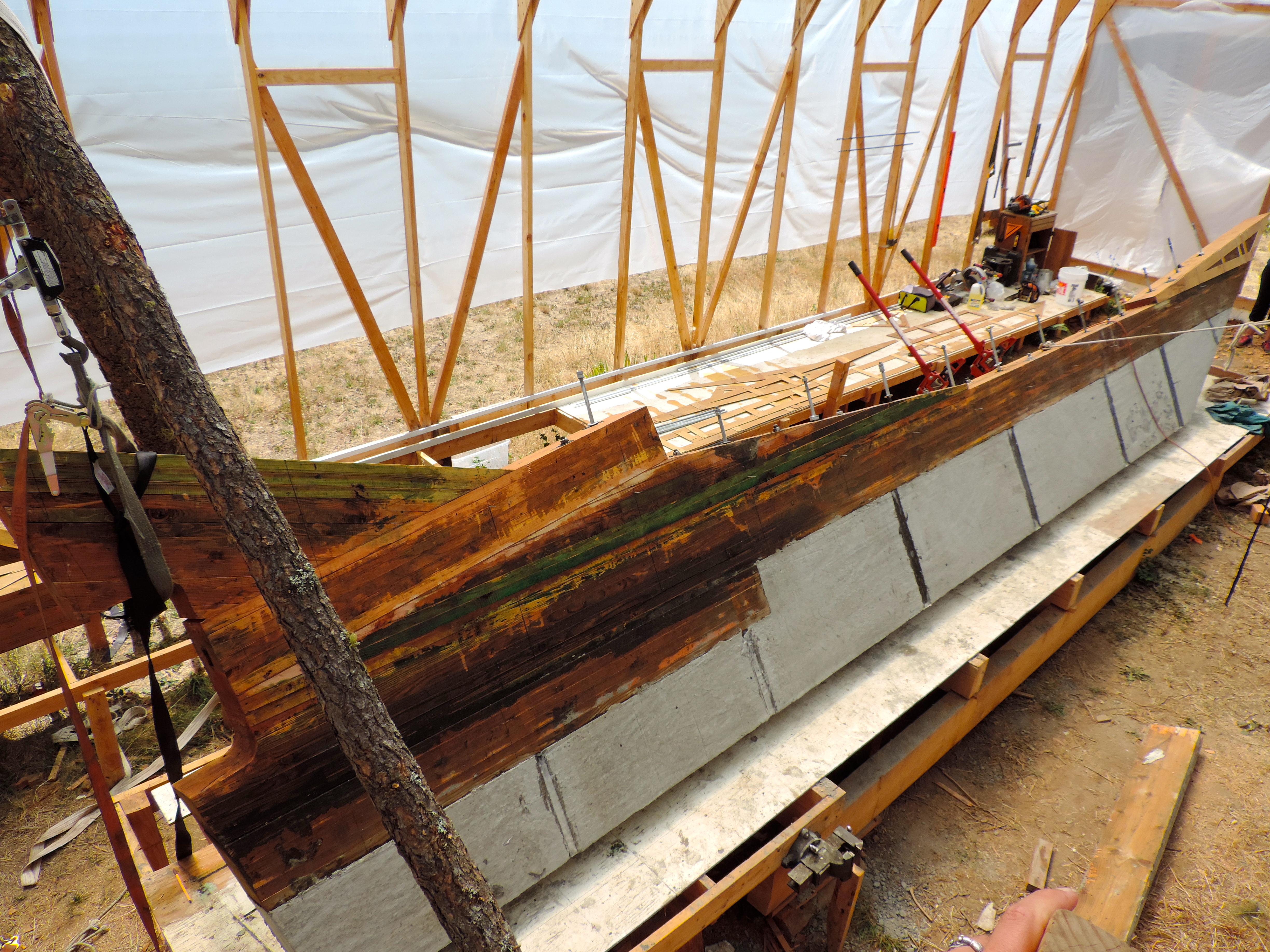 Forefoot, stem, and stem knee added up front. transom knee aft. She now only has a few feet of clearance from the rafters in the shed! Some slight miscalculations in determining the height of the shed….. definitely swabs fault.