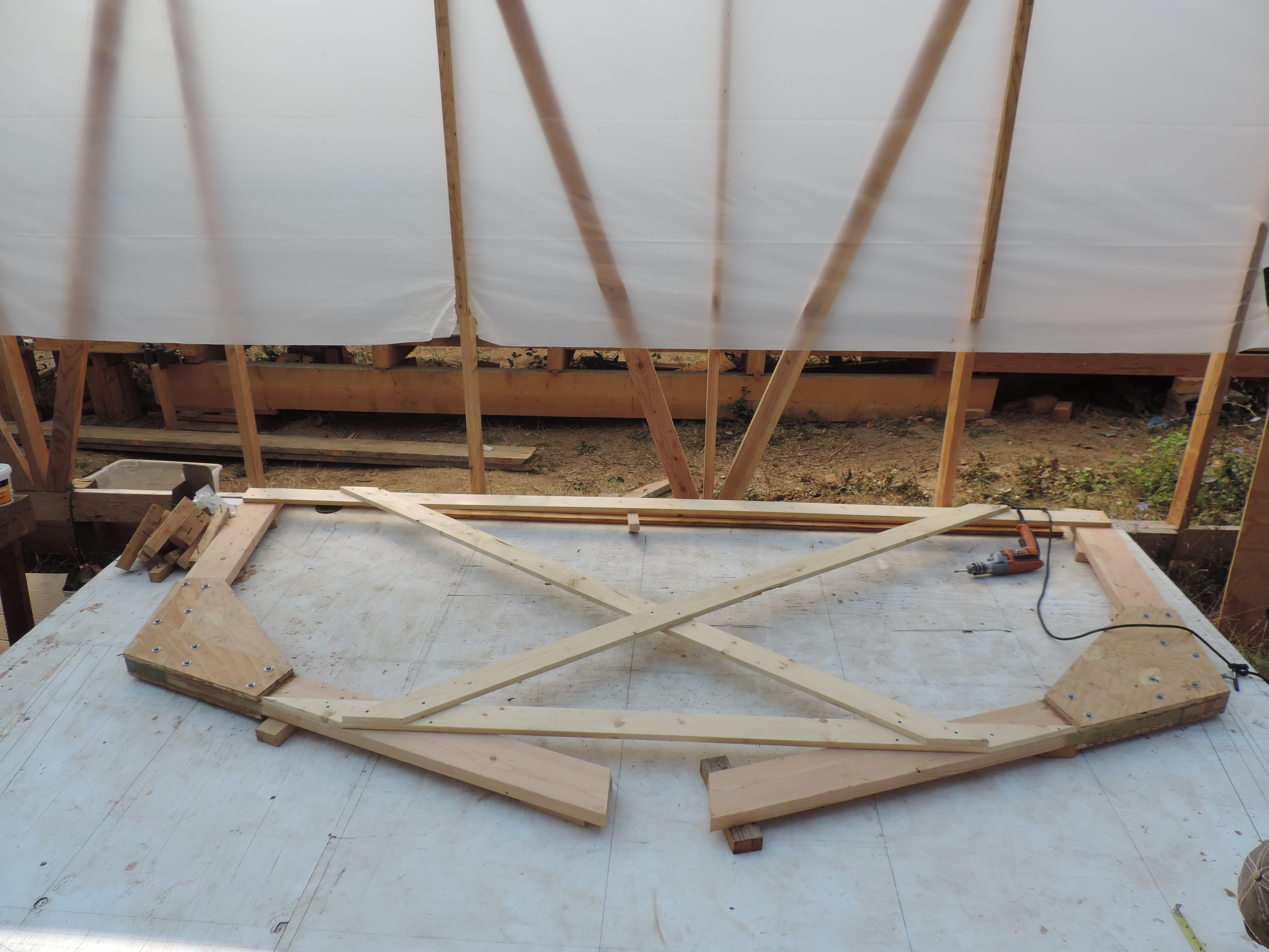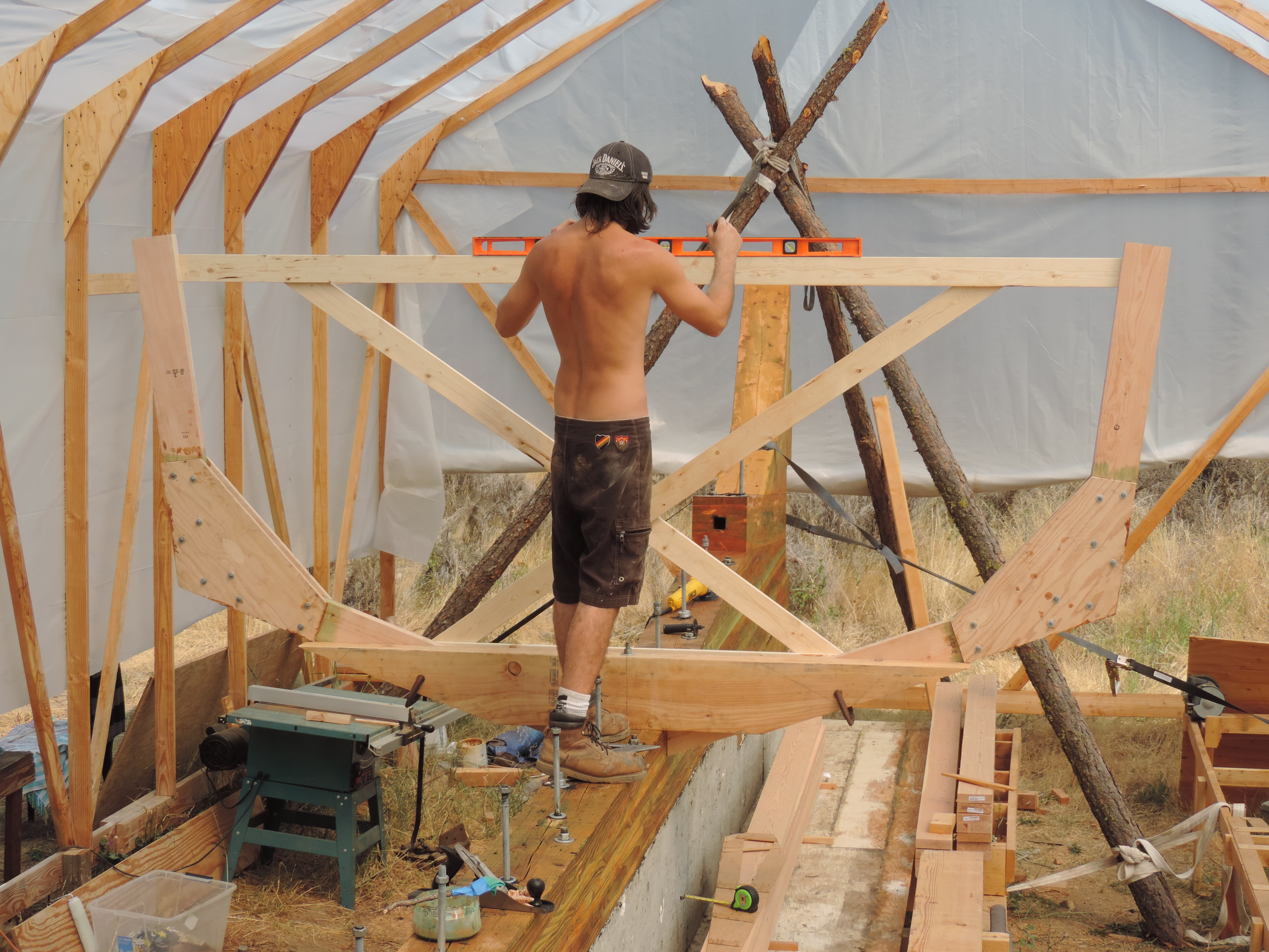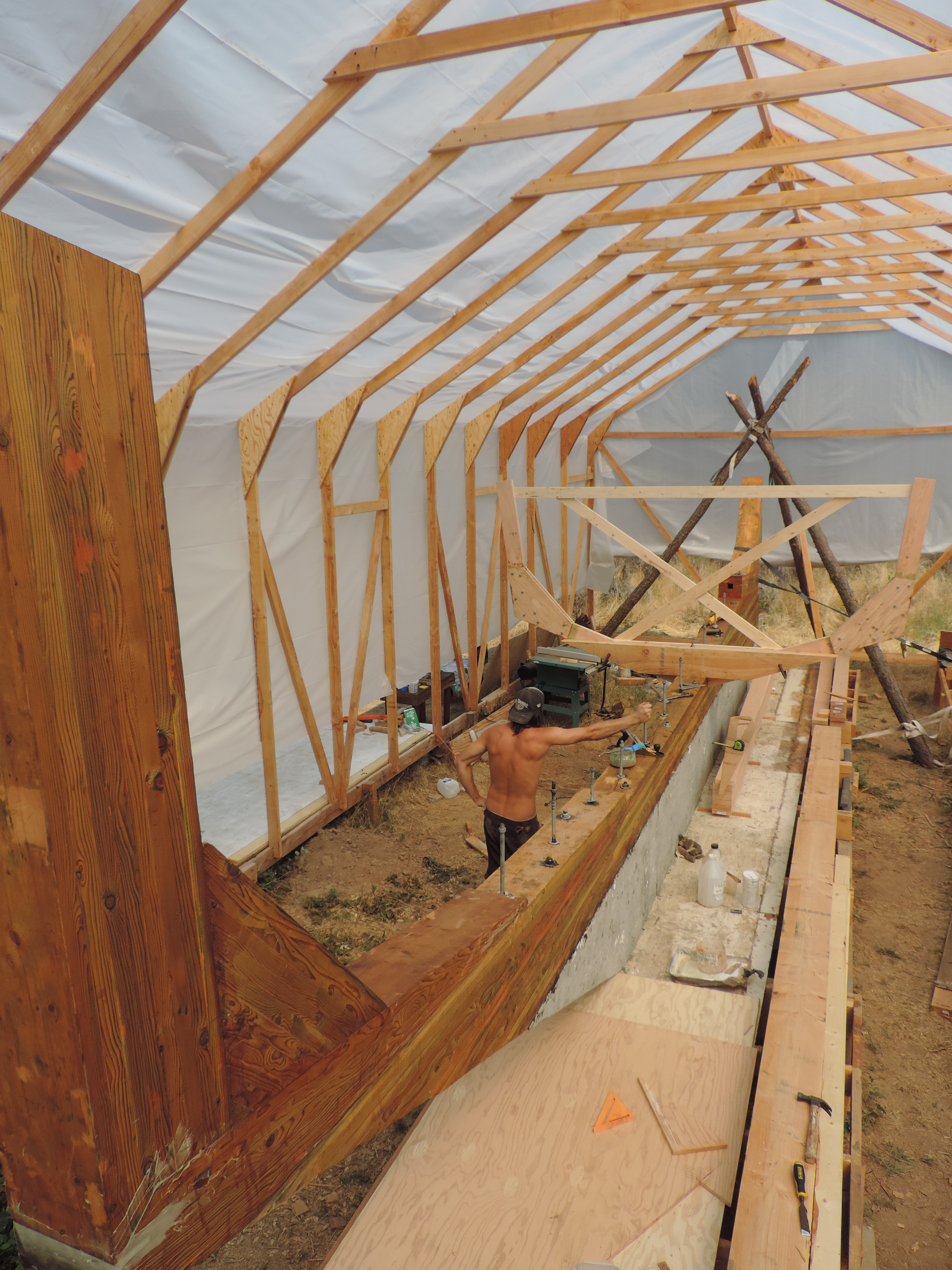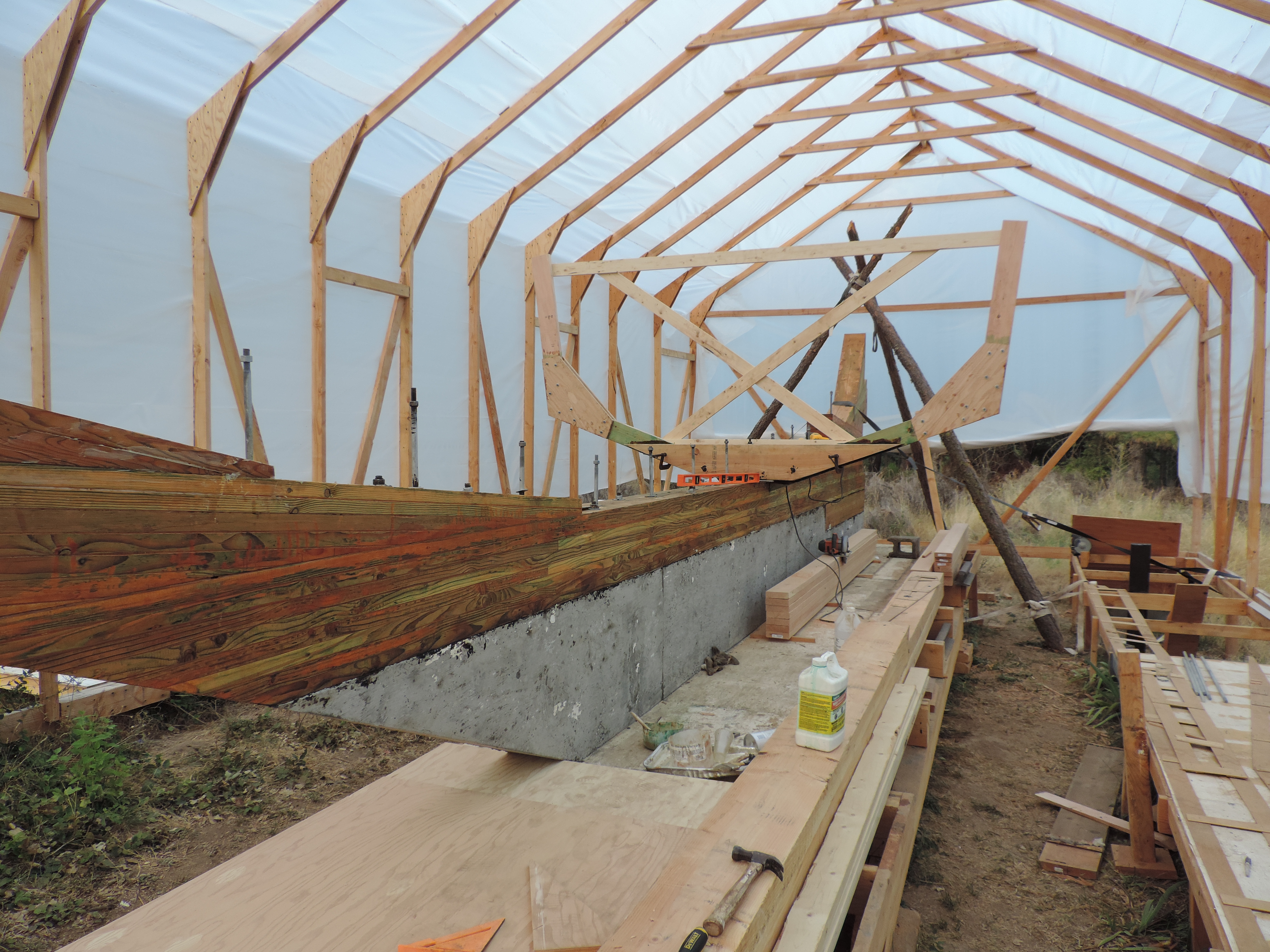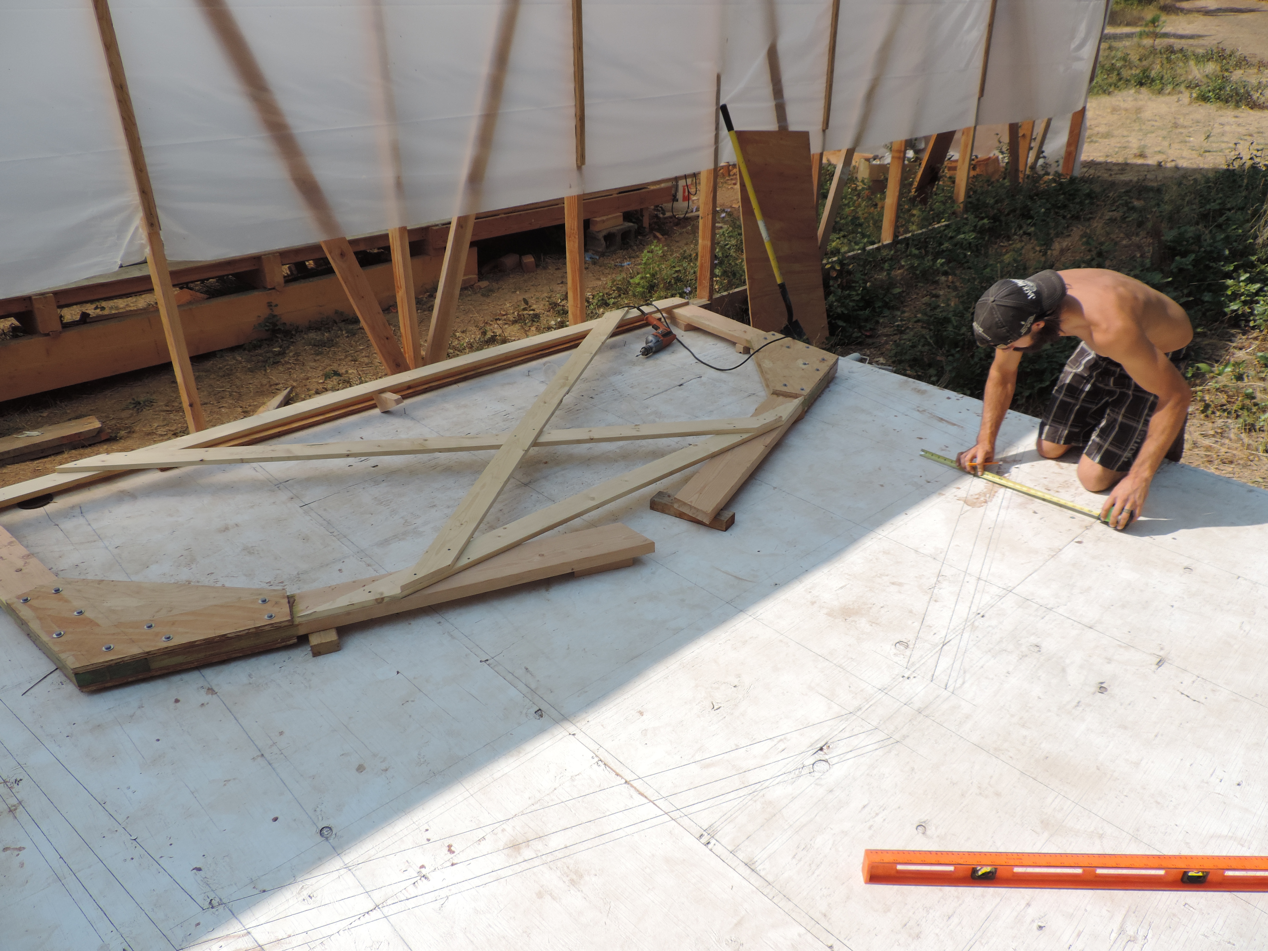 Measuring for the floor timber. You can barley make out the outlines of the frames on the table. This is what we use to find the correct shape for all the frames.