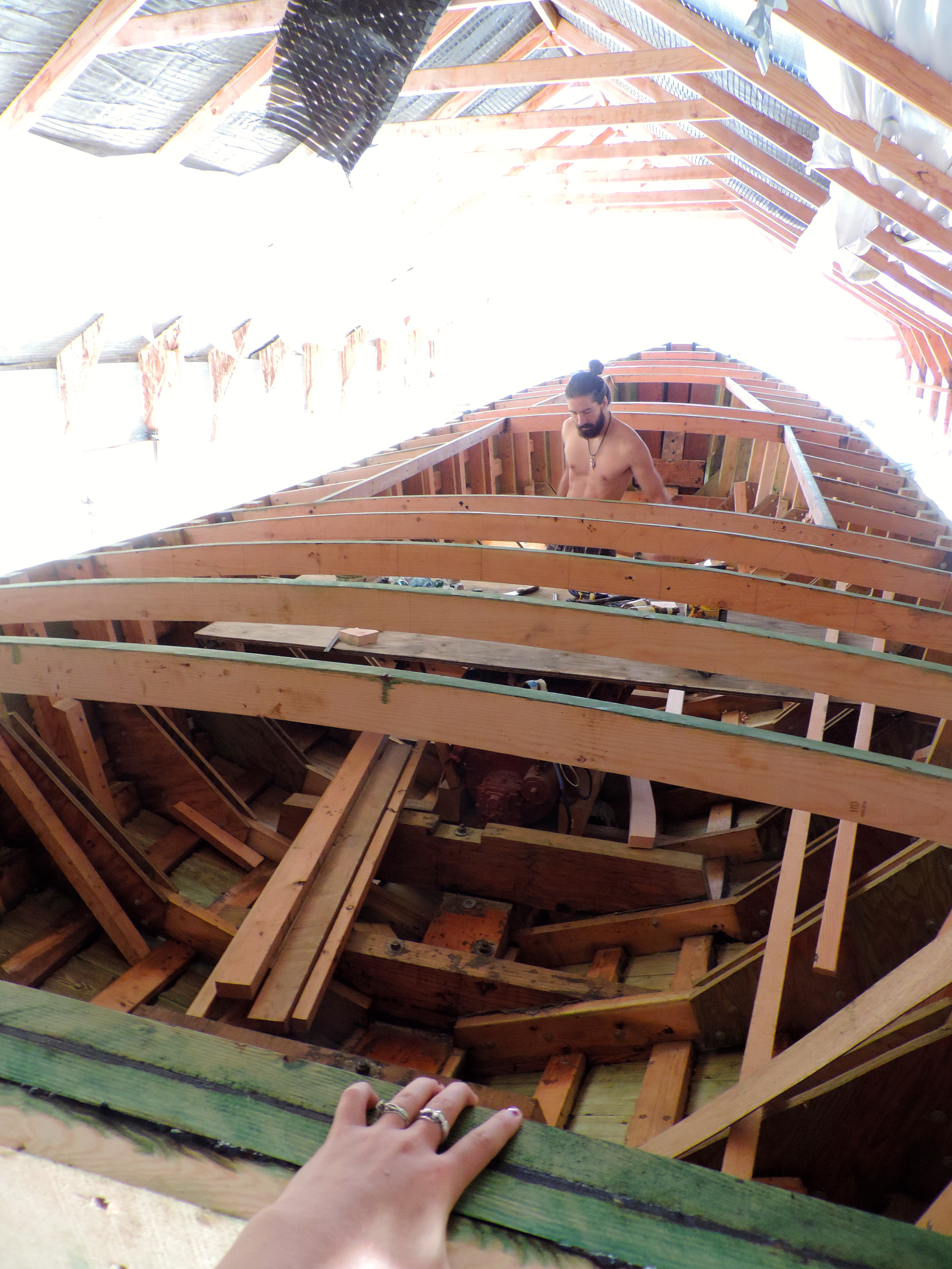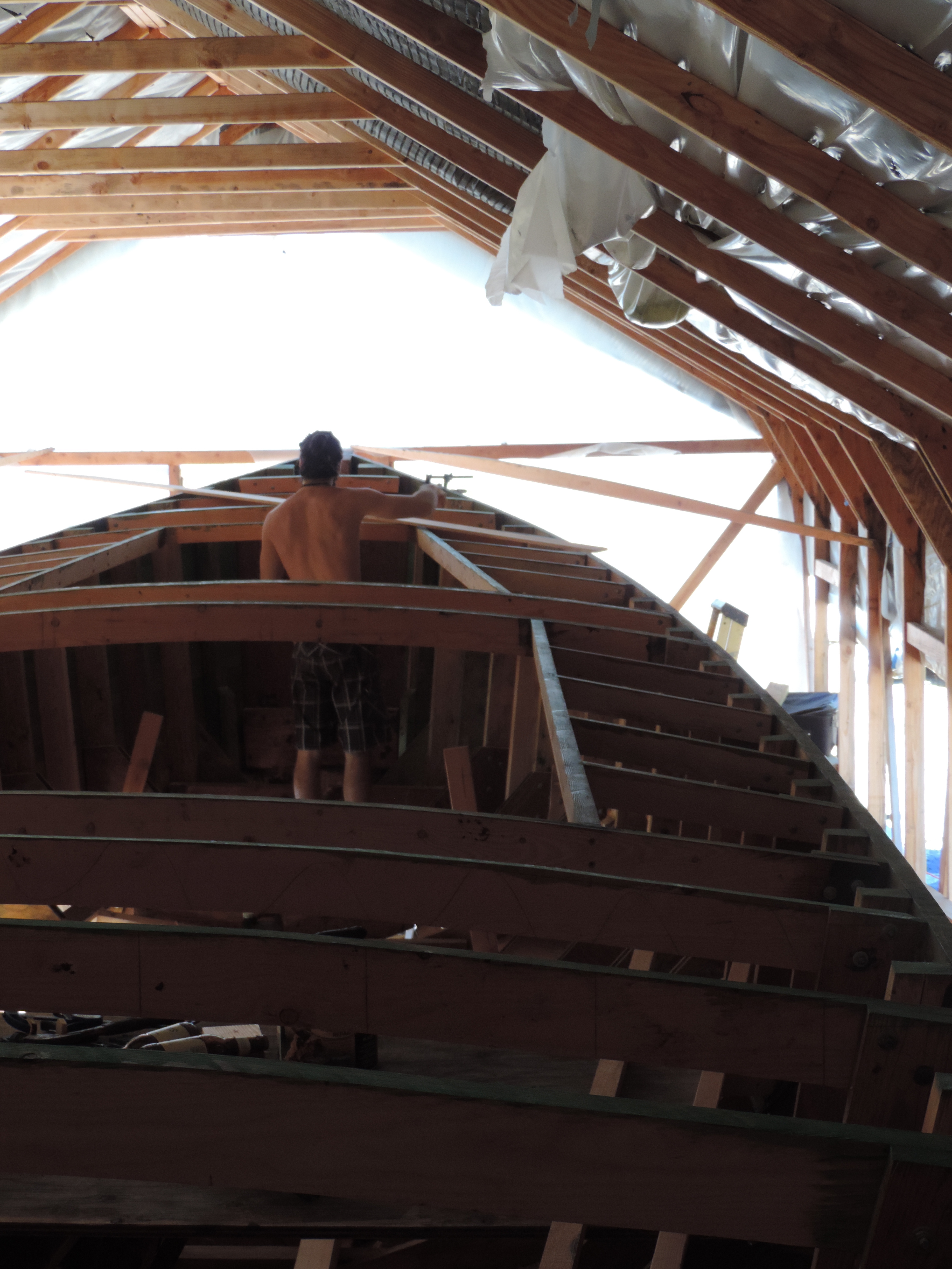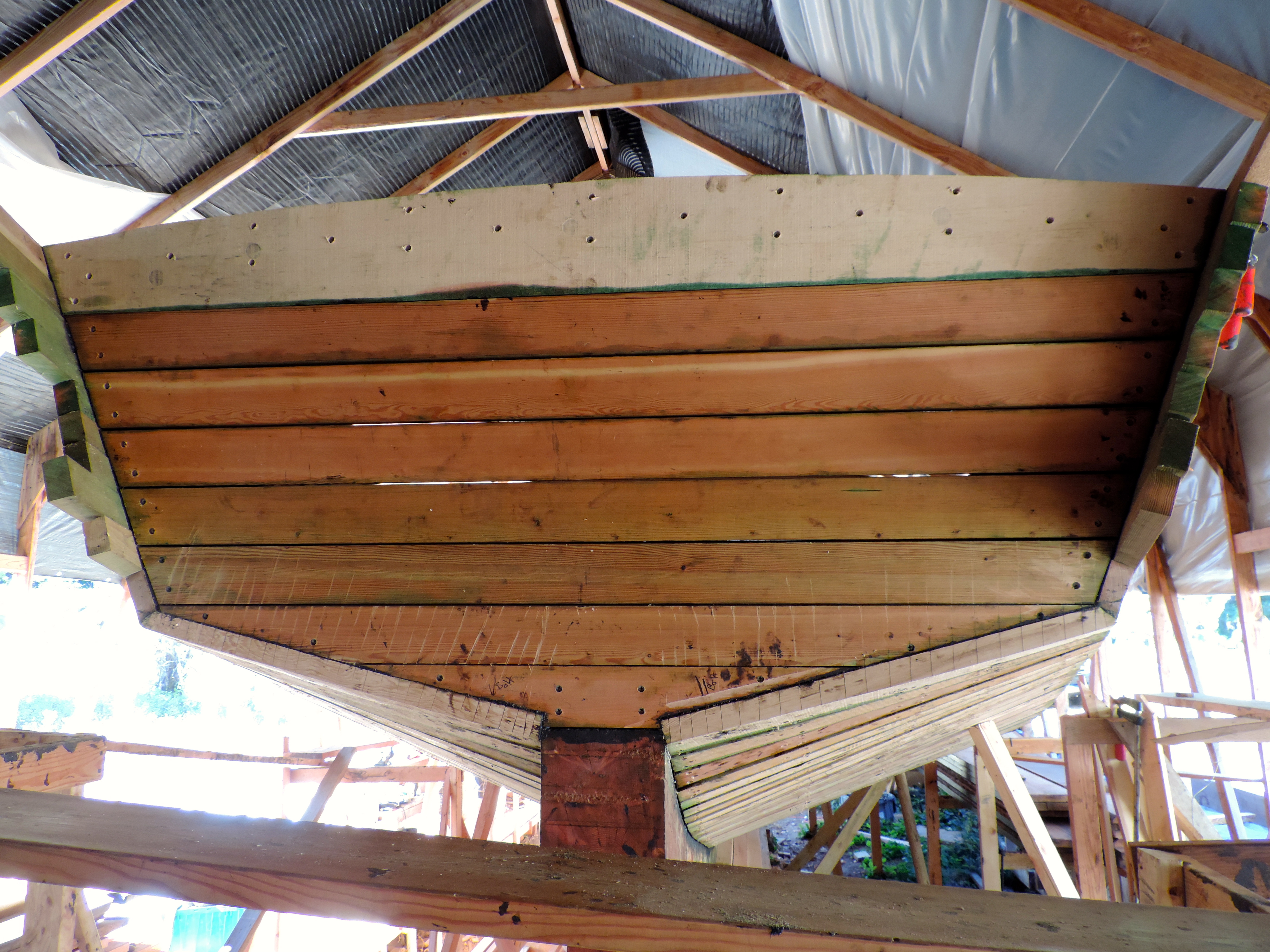 We went into Portland one day this month (couldn’t tell you what day as everyday this month feels a little blurred) to get 12 sheets of plywood. We sort of change styles once again on how we are going to lay up the deck. We’ve decided for the first layer to use 3/8 ACX plywood and top that with 1/2”X 3” strips of vertical grain fir with epoxy in between and finishing the last layer with the really pretty stuff we got off craigslist (from the planking stock) that gave us 1/4” left overs. If you’re confused that’s okay, me too.