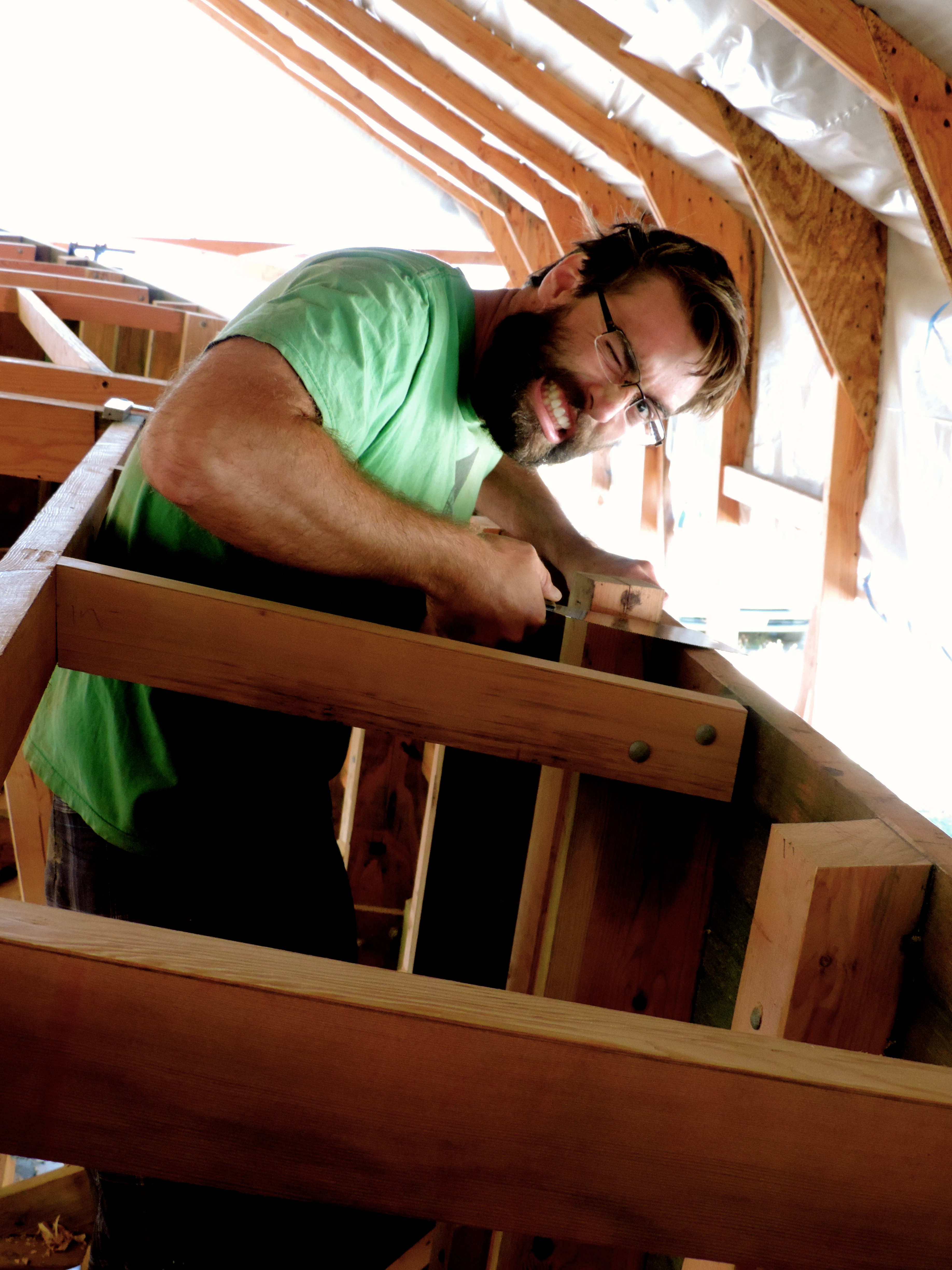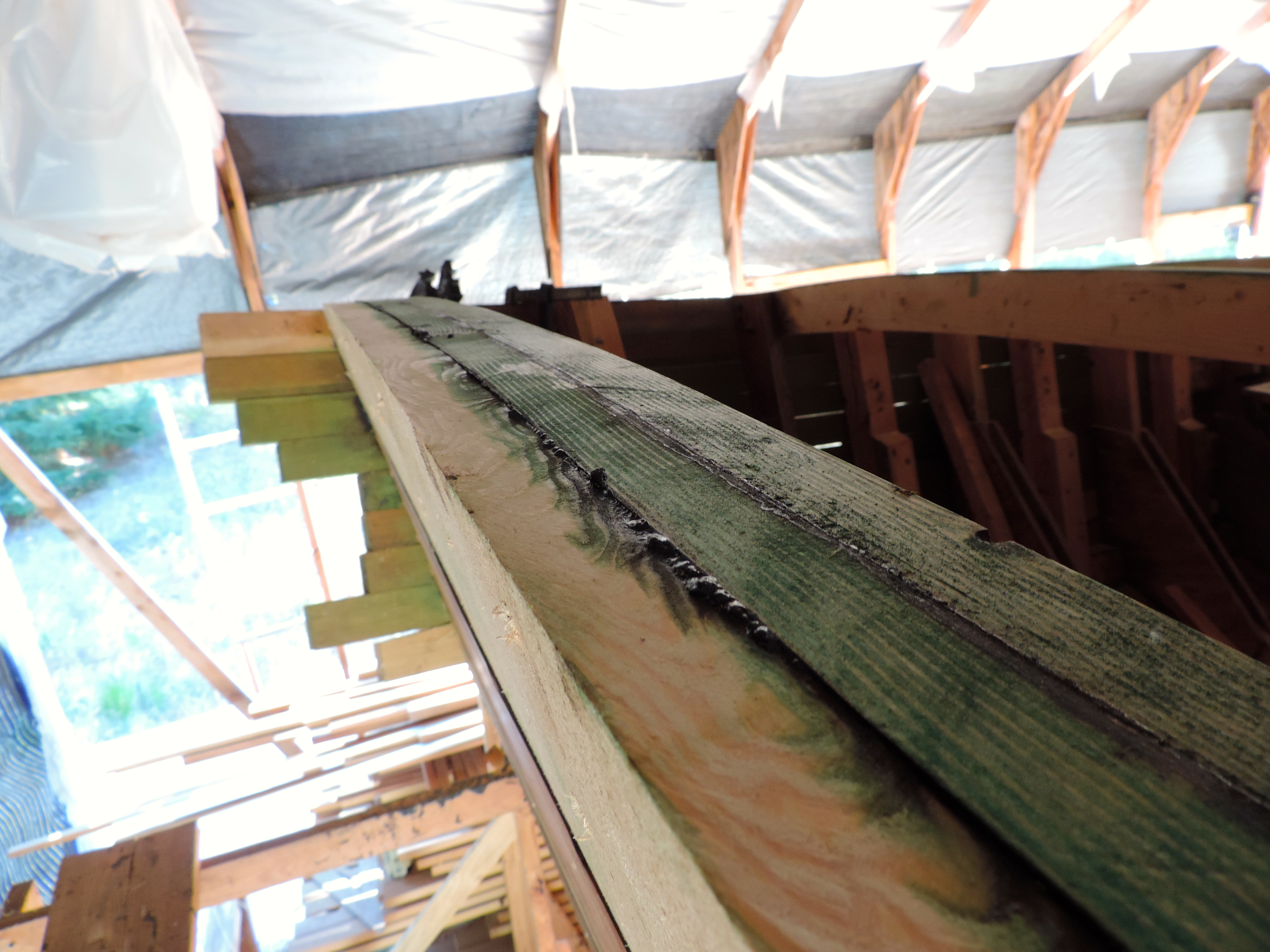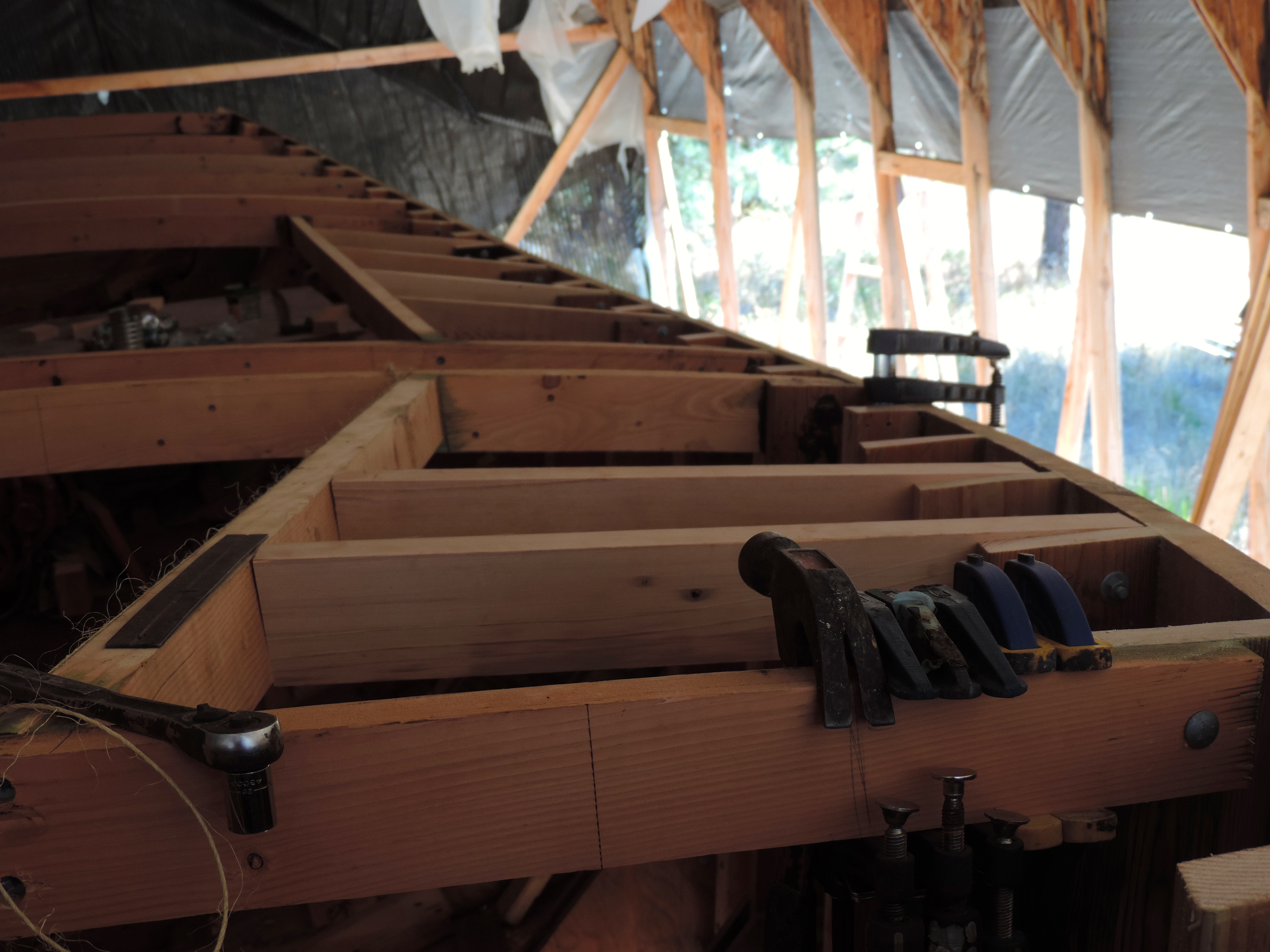We went into Portland one day this month (couldn’t tell you what day as everyday this month feels a little blurred) to get 12 sheets of plywood. We sort of change styles once again on how we are going to lay up the deck. We’ve decided for the first layer to use 3/8 ACX plywood and top that with 1/2”X 3” strips of vertical grain fir with epoxy in between and finishing the last layer with the really pretty stuff we got off craigslist (from the planking stock) that gave us 1/4” left overs. If you’re confused that’s okay, me too.