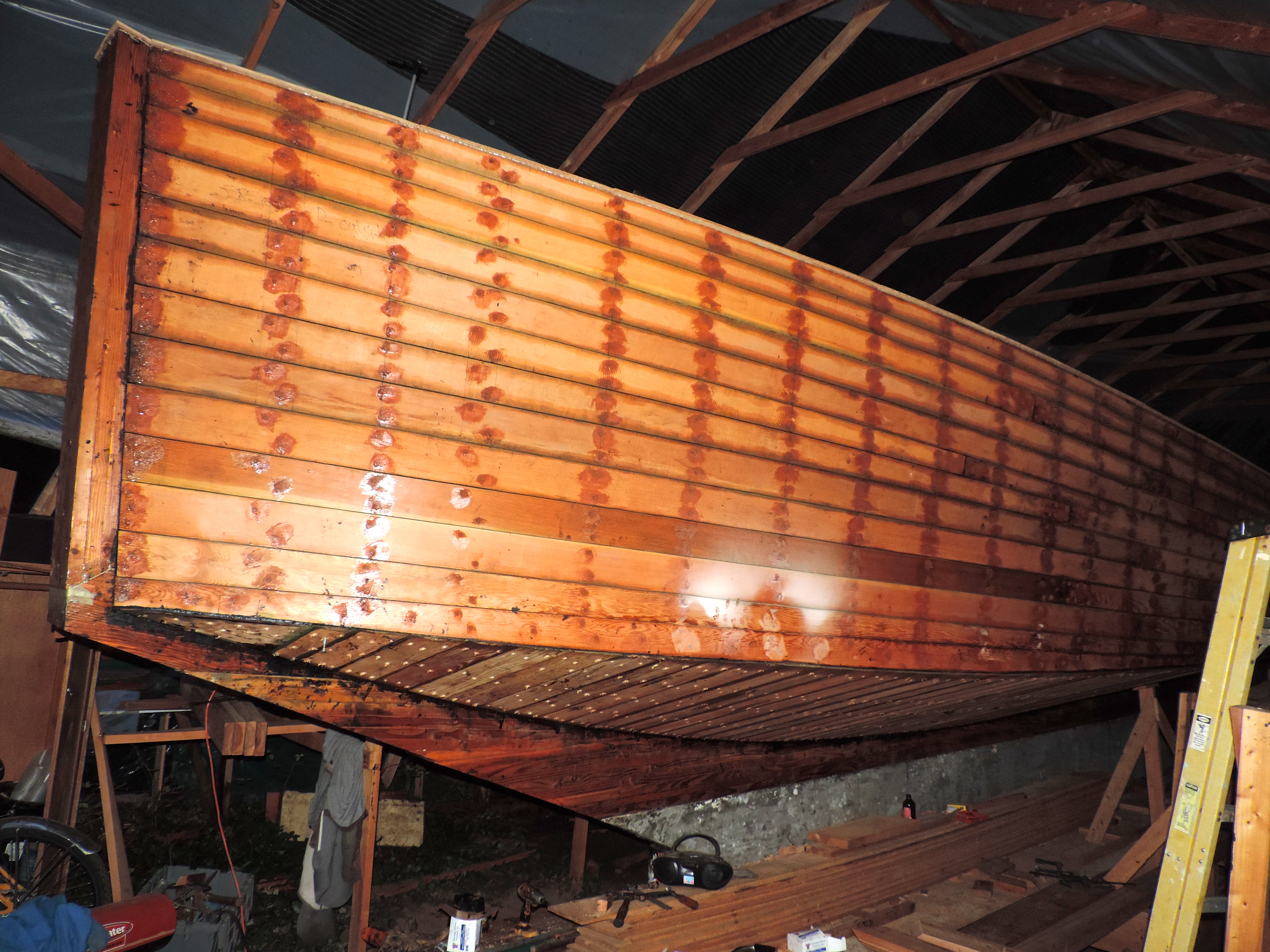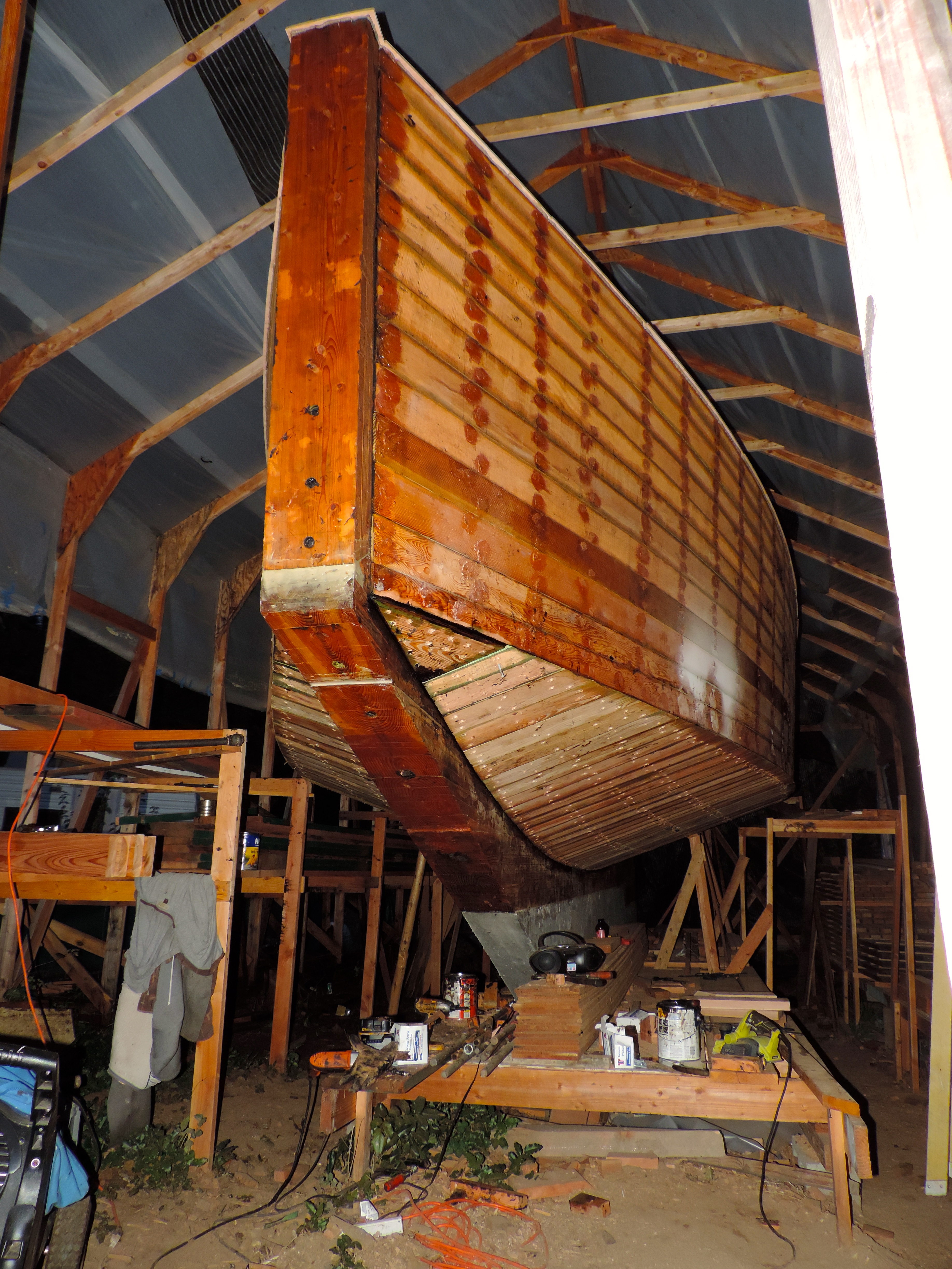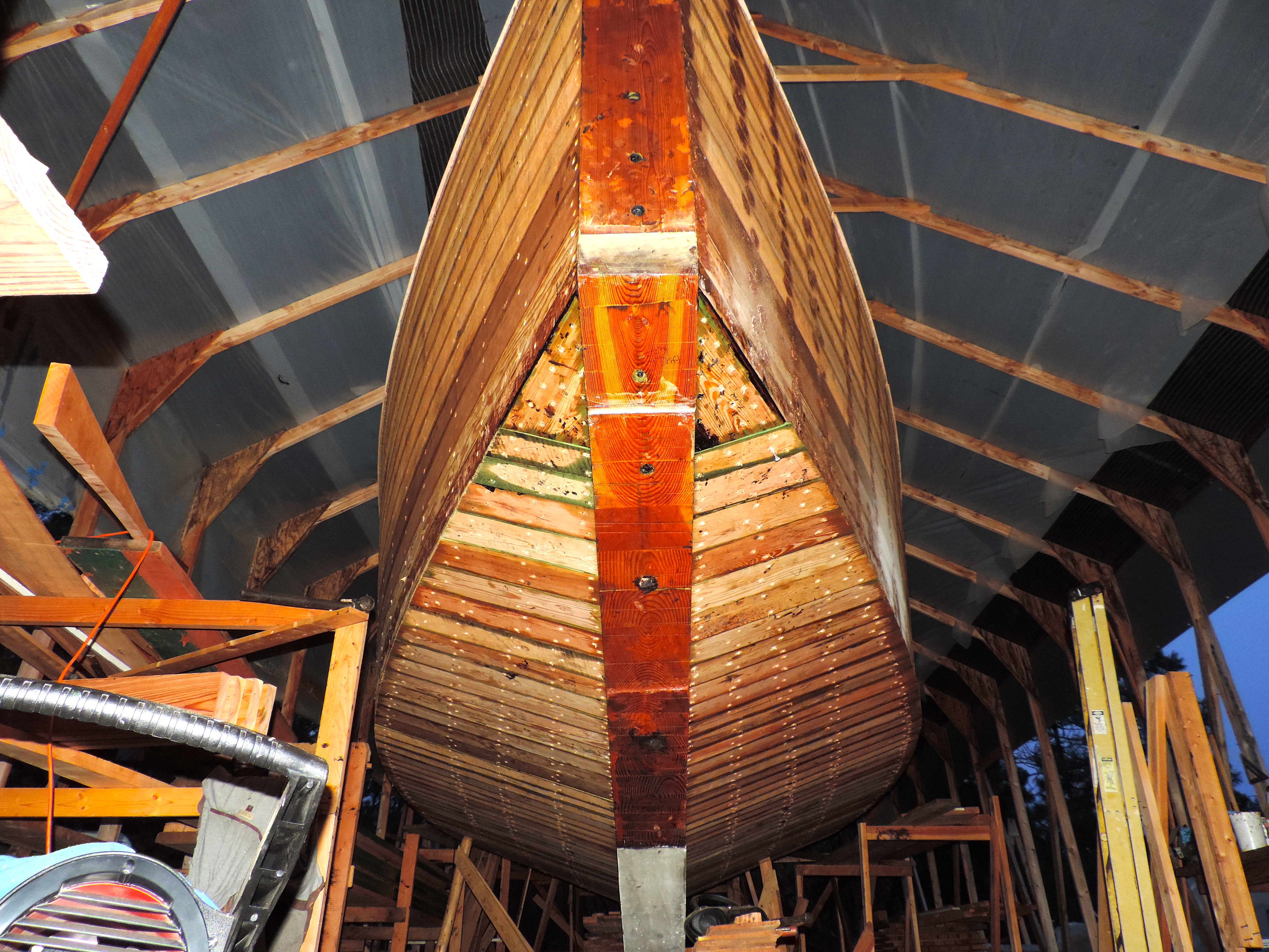 Finally we’ve finished planking the hull! the last couple planks were a little more tricky to fit, but not to bad. They are triangular, and need to be shaped to slide in right where the two rabbets meet. It’s pretty crazy, and kinda funny because it definitely hasn’t set in yet. It’s always interesting with every milestone we accomplish the excitement does’t come till later. I get in a zone to push through, and when it’s finished I don’t feel much excitement until I reset a bit. The winter is getting close, but we have once again been blessed by the lingering kindness of humanity. This time in the form of a giant kerosene heater for the shed. i’m pretty stoked because once we get the shed closed back up it should be able to heat the whole thing. We will be moving back to the deck and cabin houses now, and hoping the winter isn’t to bad this year.